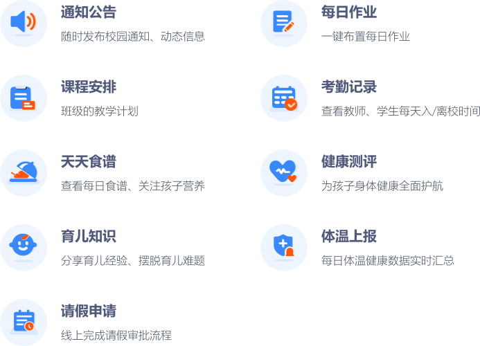 提供健康监测、天天食谱、每日课程、育儿知识、学校通知等应用,开创家校互动新模式,助力教育行业实现互联网转型升级。