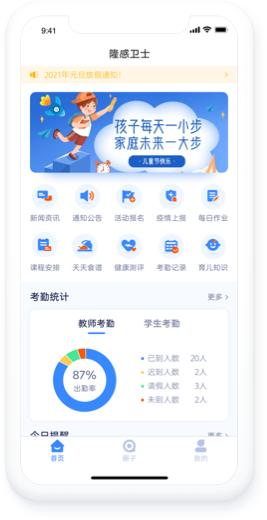 隆感校园卫士APP功能考虑细致且应用简便,拥有“园丁端”和“家长端”两个版本。有”新闻资讯、通知公告、校园活动、每日作业、课程安排、天天食谱、健康测评”等功能。能够帮助教师和家长更快捷的了解儿童在园动态,关注儿童健康成长,实现家园共育。